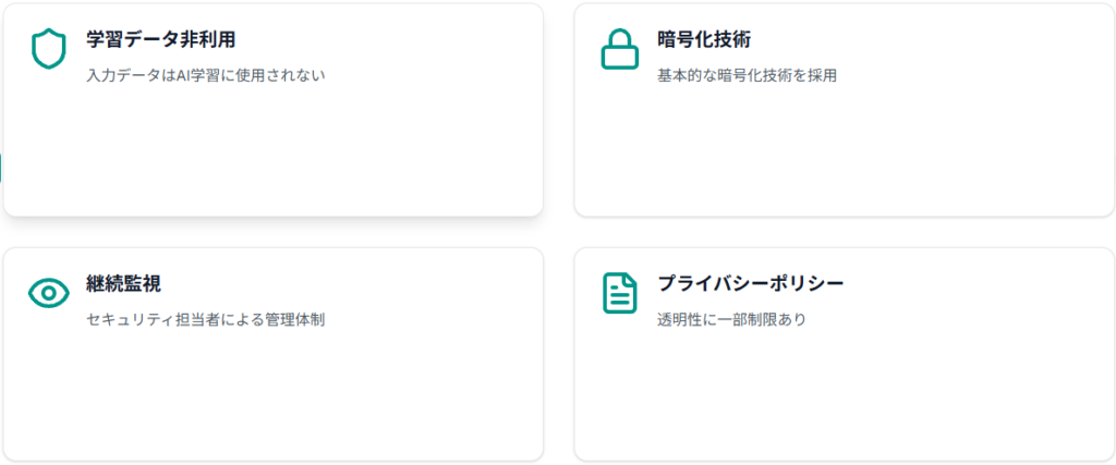 ただし、完全なセキュリティ保証は困難であるため、機密性の高いビジネスデータの入力は避けることを強く推奨します。