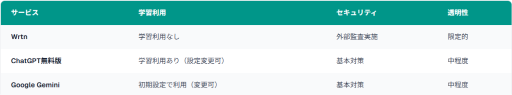 Wrtnは学習データにユーザー入力を利用しない点で安心材料がありますが、暗号化方式や管理体制の透明性が限定的である点は留意が必要です。
