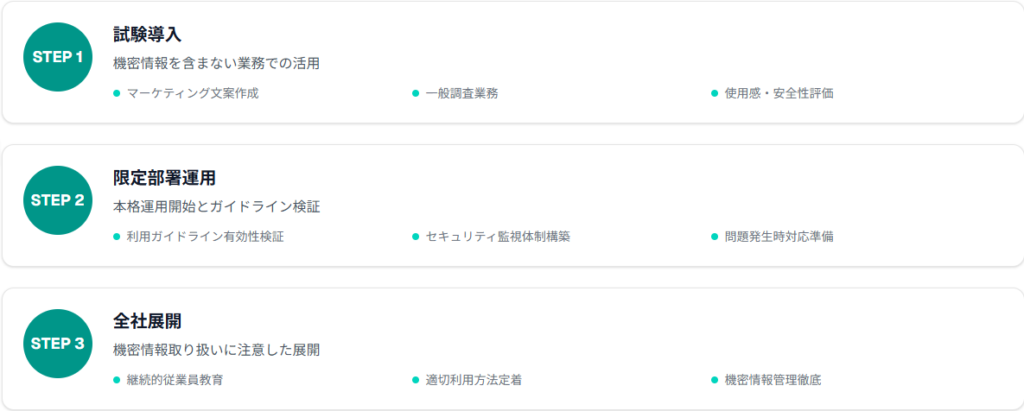 - 企業導入時の段階的アプローチと機密情報を守る社内ガイドライン策定方法