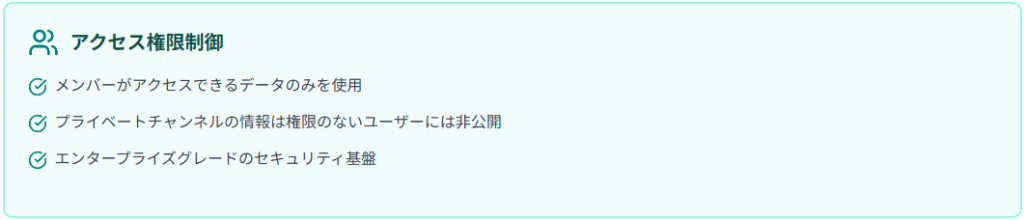 Slack AIは、メンバーがアクセスできるデータのみを使用する権限ベースの制御を実装しており、プライベートチャンネルの情報は権限のないユーザーには参照されません。