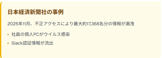 2025年11月、日本経済新聞社のSlackアカウントが不正アクセスを受け、最大約1万7,368名分の氏名、メールアドレス、チャット履歴が漏洩した可能性が報告されました。この侵害は9月に発覚し、同社は直ちにパスワード変更などの初動対応を実施しています。
