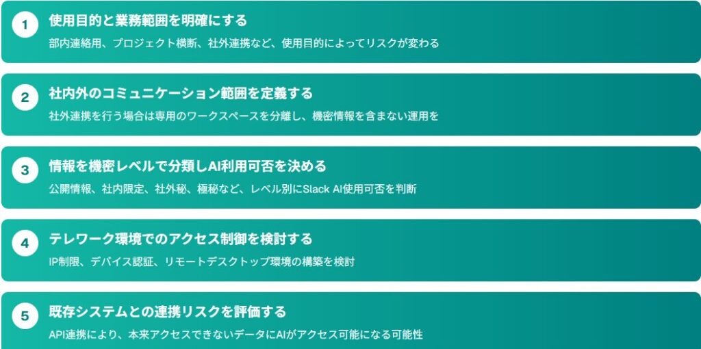 Slack AIを導入する前に、企業は自社の業務環境とリスク許容度を明確にしておく必要があります。