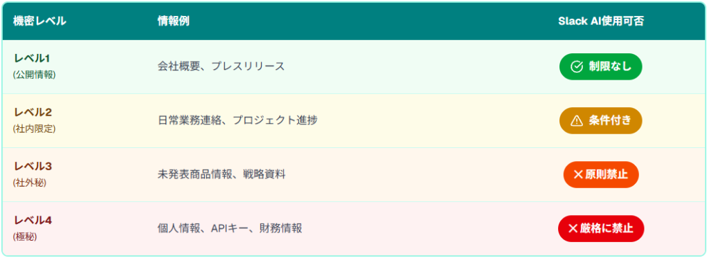 企業が扱う情報を機密レベルで分類し、各レベルでのSlack AI使用可否を決定します。機密レベル1(公開情報)は制限なく使用可能ですが、レベル3(社外秘)やレベル4(極秘)では原則禁止とすべきです。