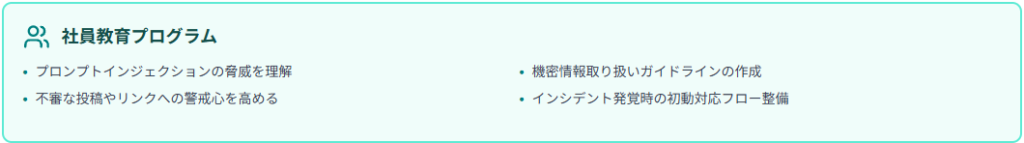 技術的対策だけでは不十分であり、社員教育が欠かせません。プロンプトインジェクションの脅威を理解し、不審な投稿やリンクへの警戒心を高める教育が求められます。