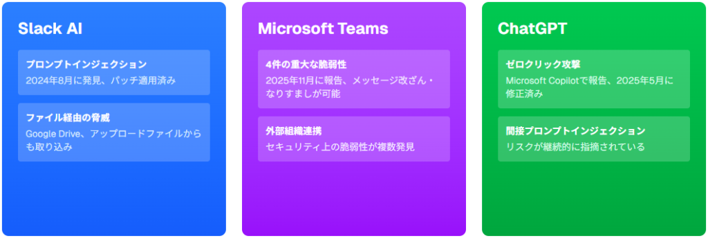 SlackだけでなくTeamsやChatGPTにも脆弱性が報告されている点が整理されており、ツール固有の問題というよりAI機能を備えたチャット基盤全般に共通する課題であることが明確に示されています。特にゼロクリック型や間接プロンプトインジェクションのような新種の攻撃手法は、ユーザー操作を伴わず被害が生じる可能性を示し、運用面の警戒が不可欠です。