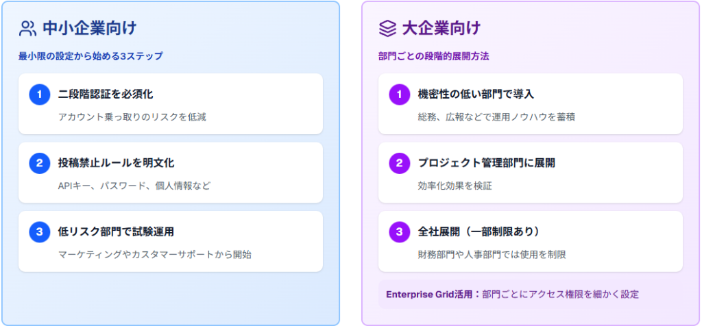 企業規模に応じた導入ステップが整理されており、リソースが限られる中小企業と多層的な管理が求められる大企業とでアプローチを分けている点は実務に即しています。特に、低リスク部門からの段階的展開という流れは、導入効果を測りながら安全に広げる方法として理にかなっています。